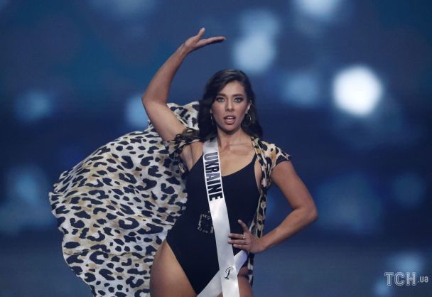 Також представниця України взяла участь у дефіле в купальниках та вийшла на сцену у чорному суцільному купальнику на бретельках, який доповнював пояс із пряжкою та легка накидка у леопардовий принт.