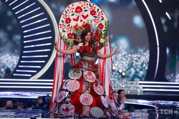 Перший образ моделі – національний костюм, який отримав назву “Вишиваний код України”. Авторкою костюма стала українська дизайнерка бренду Rada.ethno Наталія Шевчук. Костюм прикрашений п’яльцями, що символізують вишивку із усіх регіонів України.